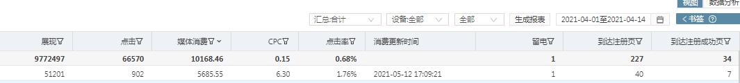 如图,系统给我们直接显示了从展现到转化各项数据。因为我跑的是cpc,对我有用的数据指标主要是4项:平均排名、cpc价格、转化数据(留电/到达注册页/成功到达注册页)、PCurl和移动url。