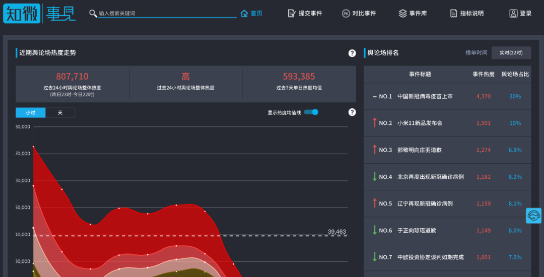 全网热点传播分析平台,可以从数据库中查找热点事件,并查看舆论走势,还可以进行对比分析。