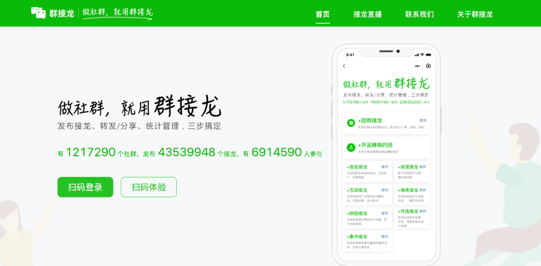 发布团购接龙,转发/分享、统计管理。