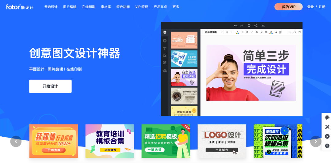 在线的平面设计、图片编辑工具。可以让不会使用PS的人也能快速设计出一张不错的图片。