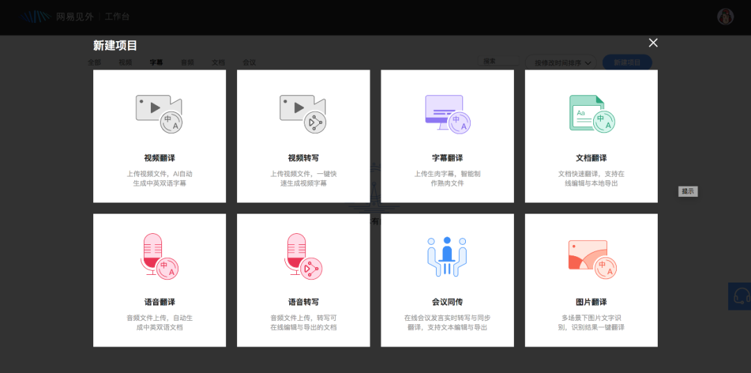 视频翻译、视频转写、字幕翻译、文档翻译、语音翻译、语音转写、图片翻译。