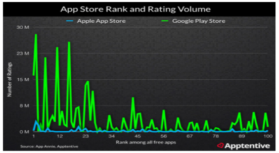 最后但同样最重要的是,一致的好评是对你的应用最高的认可,也是最高的排名因素之一。我们对去年排名前500应用分析后发现,评价(平均评分和评价数量)和排名关联最紧密。总的来说,有大量积极评价的应用会称霸排行榜。