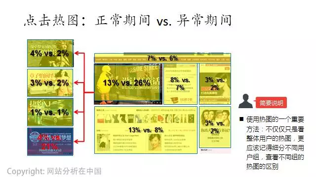 其二,细分人群的热图对比分析,例如不同渠道、新老用户、不同时段、AB测试的热图对比等等。