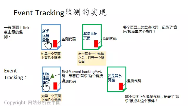 不过,有问题就一定有方法,人们发明了event tracking来解决上面的问题。event tracking本质上是对这些特殊互动的定制化监测,而由于是定制化,所以反而有了更多附加的好处,即可以额外添加对于这个活动的更多的说明(以event tracking这个方法的附件属性的方式)。结果,这个方法甚至有些反客为主,即使是一些http链接,很多分析老手也喜欢把它们加上event tracking(技术上完全可行),以获得更多的额外监测属性说明。