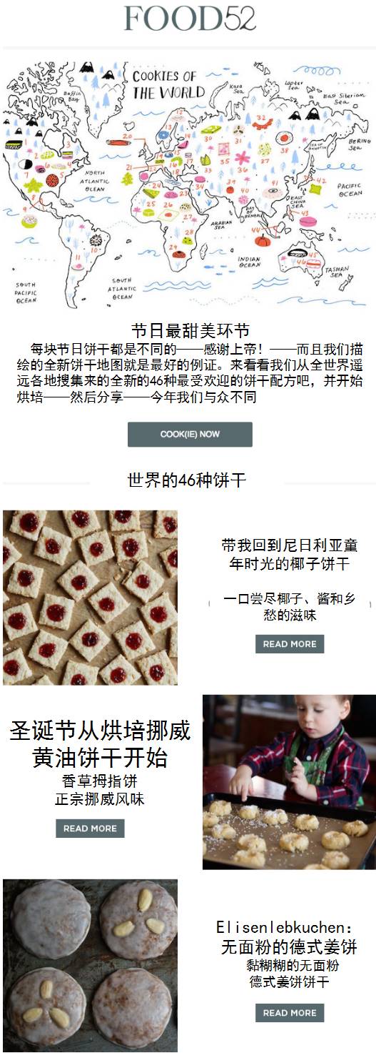 同一种产品在全球不同地区长得什么样呢?这就是Food52用这封营销邮件回答的问题,他们用一幅异想天开的图像来解释,并附有46种来自世界各地最受欢迎的饼干配方不为人知的照片和它们的故事。在完整的邮件中,除了这些配方还有为烘培者准备的推荐礼物,包括为从Food52网站上购买饼干切割机、搅拌碗以及其他有趣工具而设计的行动指引按钮。