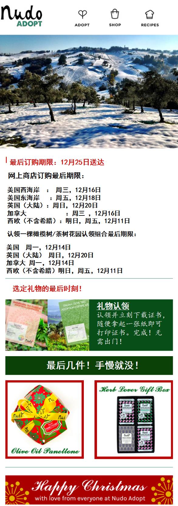 当许多电子商务邮件给你呈现了你可以从他们公司买到的所有千差万别的产品的时候,Nudo Adopt却剑走偏锋。他们预先提出让顾客“认领”意大利的一棵橄榄树,并且将该橄榄树产的橄榄油送到顾客的门口。为了确保圣诞节可以到达,运输的时机就显得尤为重要了。这是为什么这封节日营销邮件突出不同地区的顾客需要在特定时间前完成购买的原因。
