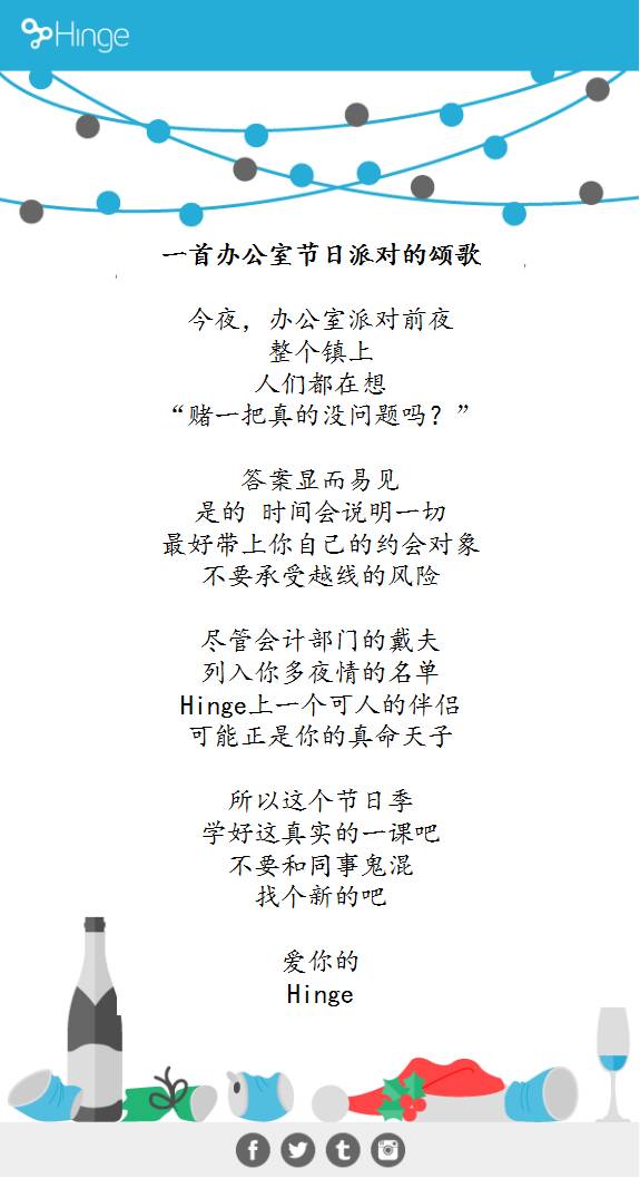 他们的时机把握得很好:某个周四我收到这封约会软件Hinge发来的邮件,即在HubSpot的节日派对前一晚——也是许多其他公司选择举办他们的节日派对的前一晚。这封邮件运用极简理念进行设计。而正是这些令人捧腹大笑的文字让这封邮件如此不凡。这是不错的选择呢!