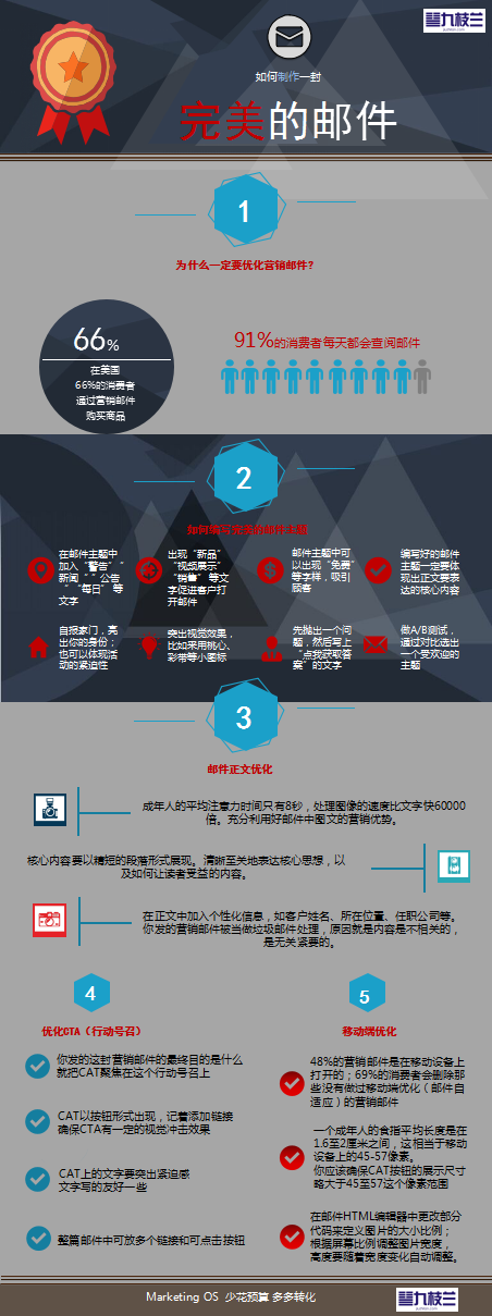 Posted in: 未分类 执行指南:一封优秀的营销邮件是如何炼成的 对任何邮件营销人员来讲,发出去的邮件能否投递到客户的收件箱,成为开展邮件营销业务的关键。你的客户不仅会接收你发来的营销邮件,他们也会收到其他公司的Email。客户是否会打开邮件取决于很多因素,比如你的邮件标题是否吸引人、发出去的邮件能否投递到对方收件箱、客户对你企业的印象如何等。这篇执行指南将给你答案。 事实上,每天有90%的消费者会查看电子邮件,邮件营销仍然是连接消费者的最好的营销方式之一。首先你要保证稳定有周期性的邮件发送,然后你要想办法让更多的客户打开并点击你的邮件。根据你对消费者喜好、注意力、需求的分析理解,去制作一封吸引人的邮件。 那么一封优秀的营销邮件需要具备哪些元素?邮件主题、正文、该如何优化?通过下面的信息图,我们一起来了解。 作者简介: 译者:臧海。翻译版权由一枝兰所有。转载请注明出处。
