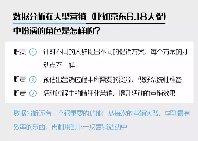 需要算出来在此次活动中,会有多少人会购买这个产品,而他变成客户的过程是有成本的,包括库存、服务器、带宽、客服人员、物流支持系统等各种资源,否则用户来了以后买不到东西,或者客服人员紧缺用户无法获得及时反馈、投诉率上升,这都是问题。所以营销前的系统性规划,也是数据分析部门的职责之一。