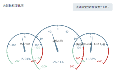 关键指标变化率部分,采用了我们日常生活中常见的ECharts汽车仪表盘的呈现形式,形象化展现关键指标对比过去N天的变化概率,既便于我们记忆数据,又形象美观。例如下图,通过图表,我们可以很清晰的看到点击次数对比昨天下降15.54%,但转化下降了26.23%,转化下降高于流量下降幅度,整体CPA上升11.58%。