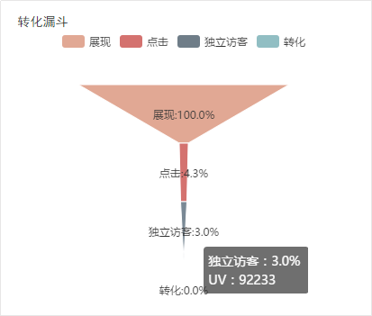 转化漏斗图,很直观地看到搜索推广从最初展现、点击、到进入网站和最终产生转化各层级的流失率,便于我们从宏观上把控整个搜索引擎推广的各环节,假如在整个转化漏斗中从独立访客到产生转化的概率很低,是影响整个转化路径的重要环节,那您需要关注的是如何提升搜索推广的转化率;如果在整个转化路径中,从前端广告的点击到成为独立访客的概率很低,你需要做的就是检查广告和着陆页的匹配度、网站的打开速度等影响点击到达着陆页的影响因素。