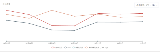 分日趋势图,可筛选你所关注的关键指标,观察每日的变化趋势图,例如在下方的分日趋势图中可以很明显的看到29日和30日点击和转化数值明显下降,且转化的下降幅度更大,CPA上升明显。相比需要在excel表格中选择不同的指标,然后排序和观察数据,分日趋势图更加直观,也便于我们快速发现问题。