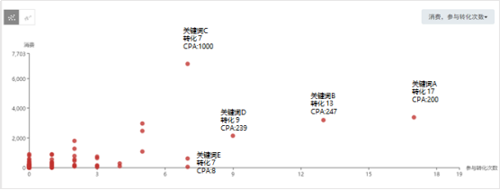 一枝兰SEM优化工具将散点图矩阵应用到SEM投放分析,如下方关键词分布图,将关键词按消费和转化维度进行分布,通过散点图我们可以很清晰地看到账户关键词的一些规律: