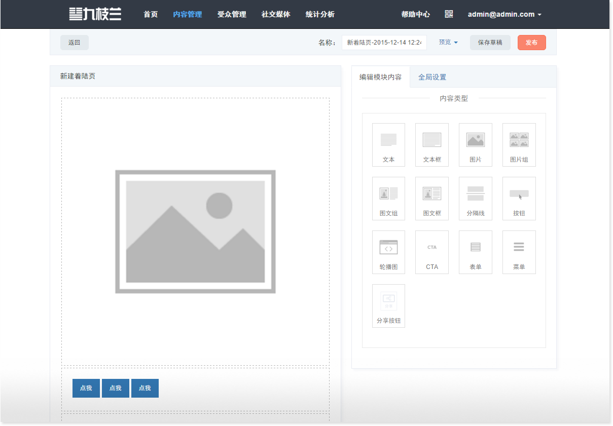 简单几步就可以创建着陆页. 我们提供方便的拖拽功能,着陆页模板. 一枝兰工具使您可以方便的改变页面的布局与设计。
