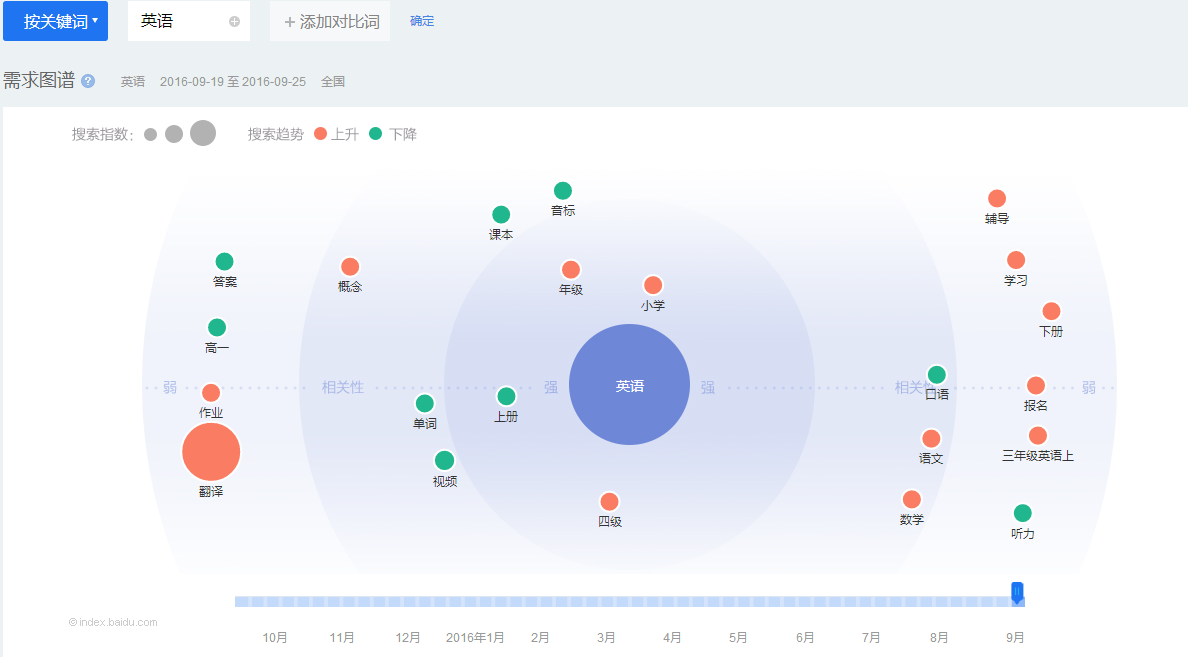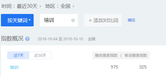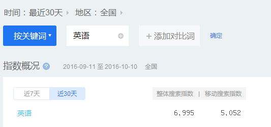 当然对于网民的搜索行为,营销人员也是捉摸不透的,有可能网民想了解英语,背诵英语单词,英语音标查询,英语口语培训等当然站在SEMer营销人员角度上,这些人群都有可能是我们的潜在客户群体。因此我们不能遗漏每个客户,当然通用词的转化率是比较低下的。下面我们看下“百度指数”中关于“英语”一词
