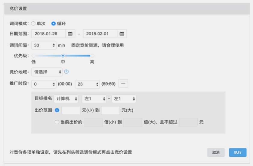 单次循环双模式调词,日期范围长可到90天;调词间隔最短5分钟,优先级可对某一部分关键词进行优先高频调整;竞价地域根据媒体端的推广地域进行选择;竞价时段可进行多时段多目标设置,把握竞争高峰;