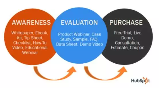 用户认知阶段:(提供)白皮书、电子书、模板表格、检查清单、视频、有教育意义的在线研讨会;用户评估阶段:(提供)产品在线研讨会、案例研究、样本、常见疑问解答、数据表、演示视频;用户购买阶段:(提供)产品免费使用、现场演示、咨询、评估、优惠券