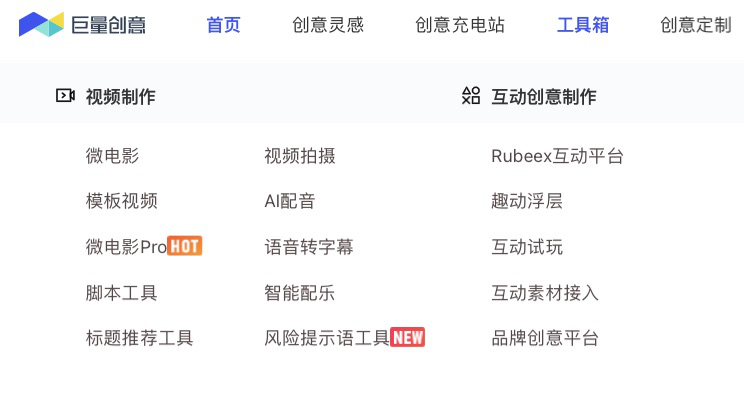 进入巨量创意的官网,我们可以看到有文本标题创作工具、有短视频脚本创作工具、有智能字幕工具、有创意撮合平台、有AI配音工具等等。